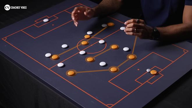 我在他手下經(jīng)常踢6號。弗里克喜歡讓邊后衛(wèi)高位壓迫對方的邊后衛(wèi),當(dāng)我們轉(zhuǎn)換球時,可以利用另一名中衛(wèi)或邊后衛(wèi)完成轉(zhuǎn)移。但也有困難:當(dāng)對方前鋒回撤,我們的中衛(wèi)未必能頂上,邊后衛(wèi)又要盯另一名攻擊手,于是我們要主動補(bǔ)位。如果我們沒能切斷這腳球,對方就會試圖把球打到弱側(cè)。另一名8號必須聰明,提前封鎖傳球路線。